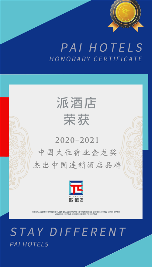 派酒店凭借个性化及创新模式荣获第十三届中国大住宿业金龙奖“2020-2021杰出中国连锁酒店品牌”荣誉称号。