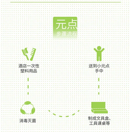 每一家加入元点计划的 ZMAX HOTELS和潮漫酒店,都会回收客房中使用过的一次性塑料用品(牙刷、梳子等)。门店的伙伴会将它们统一寄往塑料重塑企业「汉和集团」。 在那,"无用"的牙刷、梳子们将被消毒灭菌,回炉再造成符合国家标准的笔盒、尺子、塑料桌椅等文具。通过环保助学活动,它们就能去到有需要的孩子身边啦。
