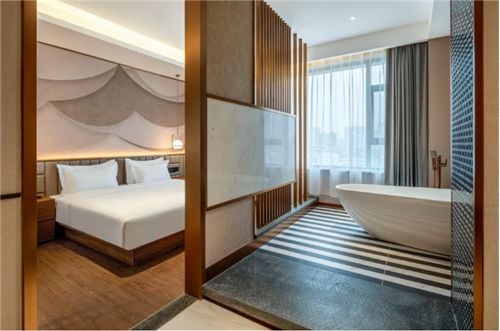 坐落于山西晋中的ZMAX HOTELS,以"一石一木"为设计元素,在室内空间再现山峦起伏的景象。
