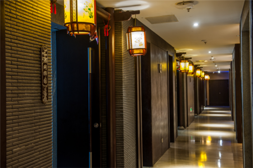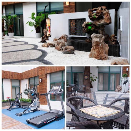 酒店二楼还设置了空中花园,仿照苏州园林风格的假山,四周木质的墙面加上青花瓷风格的灯具以及顶部的镂空图案无不凸显着江南文雅的气息,健身器材及娱乐活动设施一应俱全是客人休憩、品茗的好去处。
