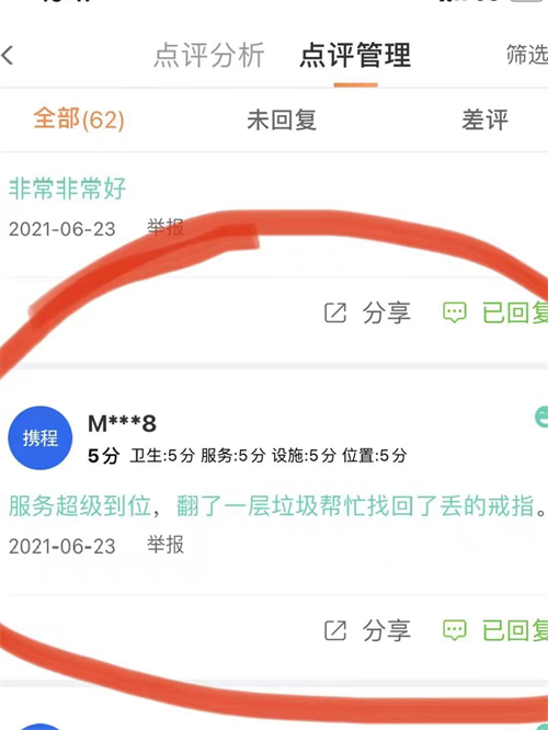 2021年6月23日,一位退房的客人将婚戒用餐巾纸包成一团放在床头柜,退房后忘记拿了 ,酒店了解到情况后,在前台和客房的努力下翻了整整️三遍垃圾箱,总算找了回来。客人深表感谢,在网评上打了5分好评并写道:“服务超级到位,翻了一层垃圾帮忙找回了丢的戒指。”简短的一句网评,代表了客人对锦江都城酒店和锦江酒店人的高度评价。