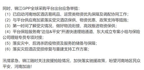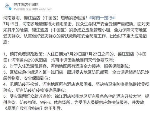 ➤针对本次河南暴雨,锦江都城酒店自即日起推出酒店免费退单及启动相应应对预案,确保第一时间为宾客提供服务和支持。
