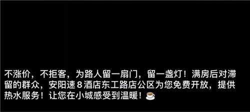 速8酒店焦作云台山岸上服务区店,为滞留酒店的旅客推出免费留宿服务,只为在危难时刻,帮助到所有受难人员。