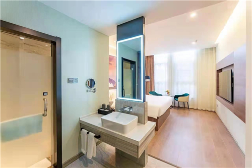 酒店通过装修与格调十足的入住体验让每一位宾客体验全新的感官体验。酒店外立面大气时尚,接待大堂明亮雅致。全大理石同色系的铺设,直线与曲线结合形成丰富的层次美感,静静铺洒出气质之美和经典质感。摆放在公区的撞色座椅,简约增添了些许艺术感。客房以实木家具为搭配,别有一份低调、温和、沉稳的意蕴。房中摆放的小巧精致休憩沙发。当飘逸的白纱滤过阳光,为空间增添无限轻盈感,让人更容易进入如家般放松之地。