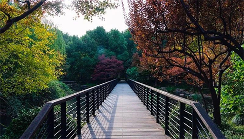 延中绿地(静安段)布局呈三部分。南部是展现历史文化的空间,以中共二大会址(建党百年,这里现成网红打卡点)和平民女子学校为中心,周围种植了规则式的墨西哥落羽杉林,红花继木和龟甲冬青,体现了庄严肃穆的气氛。中部为城市森林空间,地形高低起伏,形成高低错落、疏密有序、层次丰富的美丽景观。北部为自然山水空间,建有黄石堆砌成大型假山瀑布,栽植名贵花木,东侧毛竹成林、山上松柏茂盛、枫槭辉映,山下水池野趣昂然,辟有樱花路、榉树林荫道。形成了壮观美丽的“城市山林”景观,为久居都市的人们带来了亲近自然的感受。