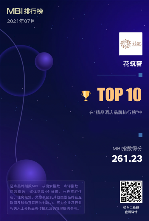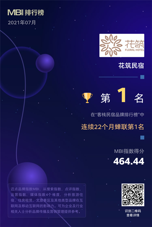 近日,一份来自迈点研究院的酒店领域品牌成绩单公布,花筑旗下定位为高端民宿的子品牌——花筑奢,首次入榜精品酒店TOP 10,花筑民宿凭借464.44分的酒店品牌指数(MBI),自2019年10月起,连续22个月蝉联“客栈民宿品牌排行榜”第一名。