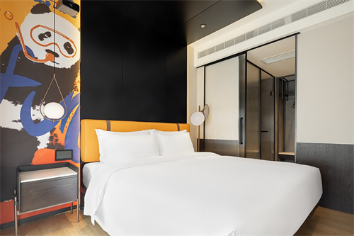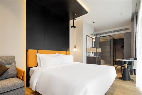 酒店整体延续了ZMAX HOTELS以“贯穿主线的黑白灰抒写不羁的生活态度,以原木色的搭配透露对品质生活的追求”这一设计格调,简约而不简单,充满休闲与温馨的氛围。在客房内使用橘色、绿色进行跳色点缀,为空间注入活力,营造出层次感。