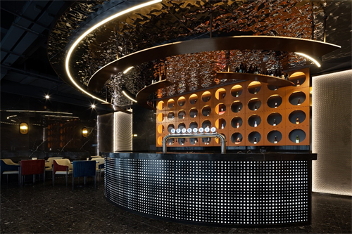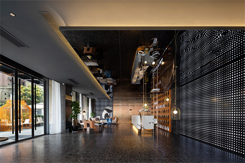「ZMAX HOTELS •成都万象城万年场地铁站店」将大堂的天花造型设计成气派的大铜锅,使用水波纹不锈钢材质生动的表现出火锅沸腾的景象,给整个空间带来活力,同时加深了空间的层次感。