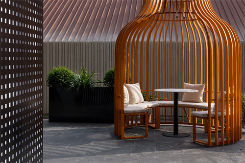红油火锅消食片,小茶馆里坐一天,则是成都人的朋克养生方式。不讲究环境,街角巷尾的老茶馆才是他们的最爱。一壶茶一把竹椅,就能坐上一整天,聊上一整天。毕竟成都的生活态度,就是要安逸要巴适。因此酒店的户外休息区特意将座椅设计成鸟笼造型,将成都的茶馆文化融入其中。