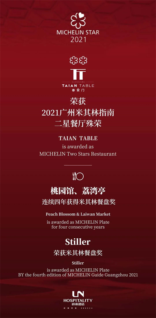 9月22日,2021《广州米其林指南》发布会在粤揭晓,作为全国三家白金五星级酒店之一,岭南集团旗下广州花园酒店餐厅以卓越出品获得米其林指南认可,泰安门餐厅获得“米其林二星餐厅”荣耀,成为今年唯一新晋二星的西餐厅,桃园馆、荔湾亭连续四年蝉联“米其林餐盘”餐厅,Stiller新晋“米其林餐盘”餐厅。广州花园酒店成为广州荣获最多米其林餐厅的酒店。