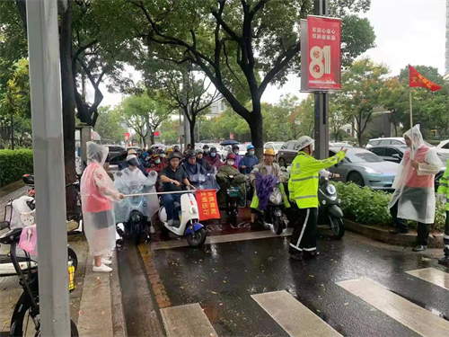 9月13日,初秋的凉风伴着中雨,在胥城书香世家酒店门口的三香路与烽火路丁字路口,道路两侧一群身穿红马甲挥动着小红旗的志愿者成为了一道靓丽的风景线,他们是由来自书香酒店集团的党员、团员组成的志愿者服务队。