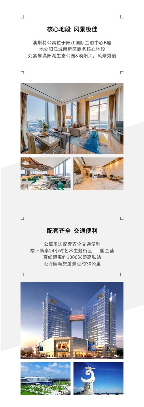 广东阳江国际金融中心朋来澳斯特公寓作为雅阁酒店集团旗下管理公寓,其依托于阳江国际金融中心这个大靠山,尽享金融中心设施设备完善及便利之处。公寓外墙是全幕墙low-e中空玻璃采光,既可降低照明能耗,又显得外墙高端大气。