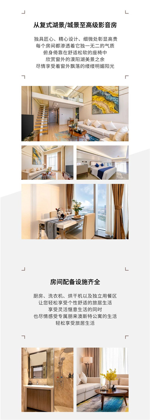 公寓4.9米奢华层高,客房室内采用的是智能新风系统,可根据室内条件自动调节送风量,同时安装的空气净化过滤装饰可确保新风清新品质,可演绎百变空间。