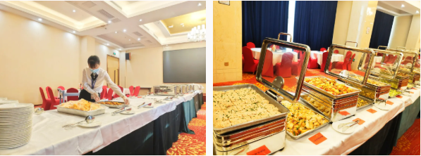 餐饮部精心布置用餐场所,提供暖心茶水、毛巾和消毒防疫物品,积极与会务负责人保持沟通,了解需求,全面准确掌握接待各项细节要求,以娴熟的技能和优质的服务,做好布置工作。