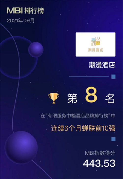 9月,潮漫酒店荣登“有限服务中档酒店品牌”榜单第8名,“商务酒店品牌”榜单第4名。ZMAX HOTELS荣登“有限服务中档酒店品牌”榜单第9名,“生活方式酒店品牌”榜单第3名。据统计,ZMAX HOTELS和潮漫酒已连续多月蝉联“有限服务酒店品牌”榜单前10,品牌力十足。