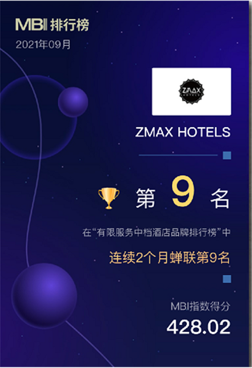 ZMAX品牌和潮漫酒店品牌双双进入迈点研究院9月“有限服务酒店品牌”榜单前10。