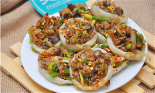 弋阳扣肉又名“经国扣肉”,是江西弋阳传统名菜,以五花猪肉佐以梅干菜、白糖、味精、精盐等蒸制倒扣而成。具有色泽红亮、梅香四溢、油而不腻的特点。