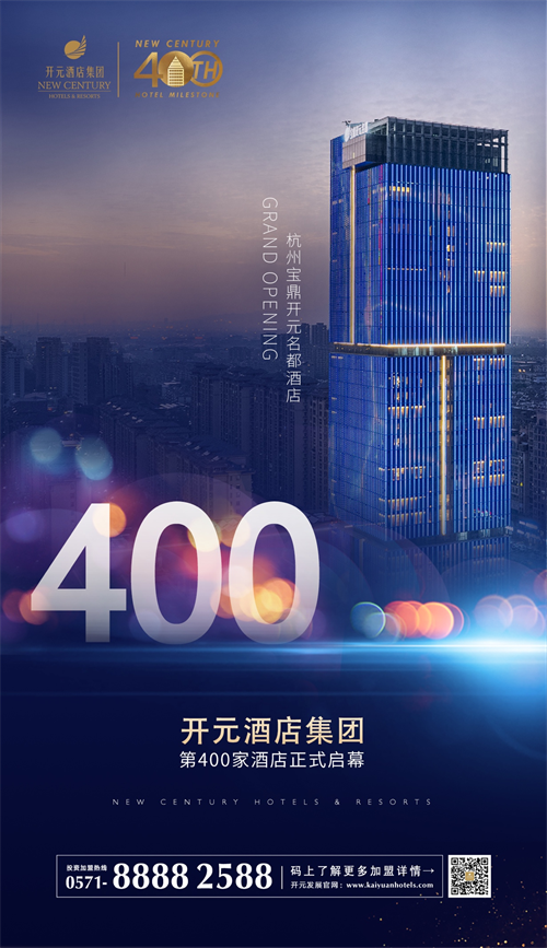 今日,开元酒店集团旗下第400家酒店——杭州宝鼎开元名都酒店盛大开业。
