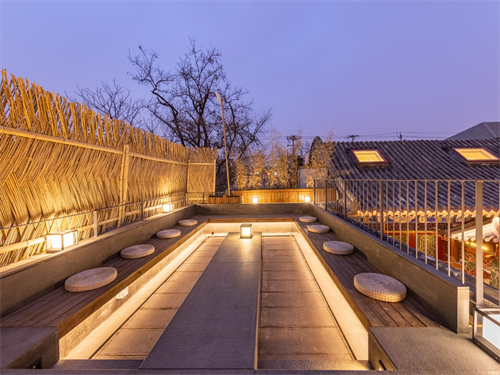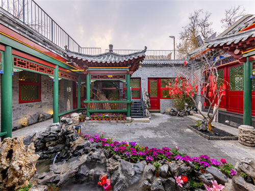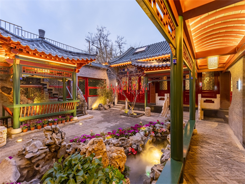 酒店保留了老北京四合院的构造,庭院以其开敞的上部,把天然空间引入建筑物的人造空间中,赋予传统建筑无穷的活力。叠石为山,筑池为水,蓝天白云黛瓦倒影在小院里造的一方水系中,宛如一副动态的水墨画。