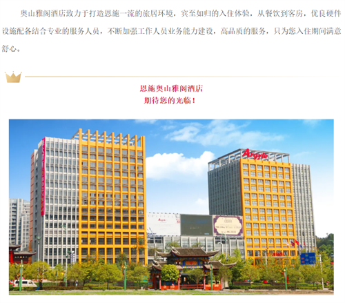 恩施奥山雅阁酒店,是一家集住宿、餐饮、及商务为一体的综合性酒店,是恩施首家五星级澳洲酒店品牌。地理位置优越,秉承“魅力商务、温馨舒适、品质典范”的理念,打造:“世界硒都、仙居恩施”的商旅首选酒店。