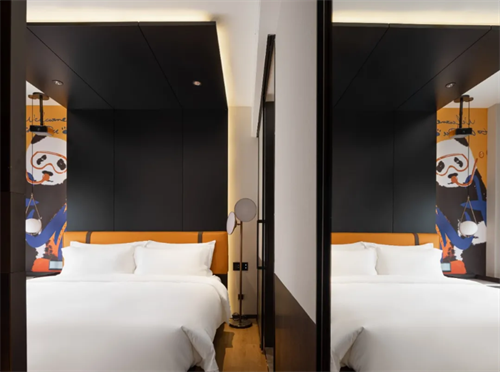 客房以黑白为主调,以竹海为空间主题,辅之以绿色点缀黑白空间,在潮流时尚的都府中,寻得一阵“竹中窥落日”的山居闲暇时光,发现成都这座城市的无限可能。放肆个性的年轻风格+浓厚的成都气息,房间是以“熊猫”“川剧”“火锅”等为装饰作为与城市互动的桥梁,给顾客最直接的“成都态度”体验,无比精妙融合了ZMAX的精神腔调,又贴合当地本土文化气息。