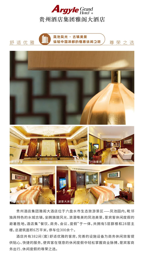 此前,根据贵州酒店集团雅阁大酒店的申请和贵州省旅游星级饭店评定委员会的推荐,全国旅游星级饭店评定委员会按照《旅游饭店星级的划分与评定》(GB/T14308-2010),对贵州酒店集团雅阁大酒店进行了正式评定。根据评定结果,最终认定贵州酒店集团雅阁大酒店已达到五星级旅游饭店标准。经全国旅游星级饭店评定委员会研究决定,授予贵州酒店集团雅阁大酒店为五星级旅游饭店,也是六盘水市第一家五星级旅游饭店。