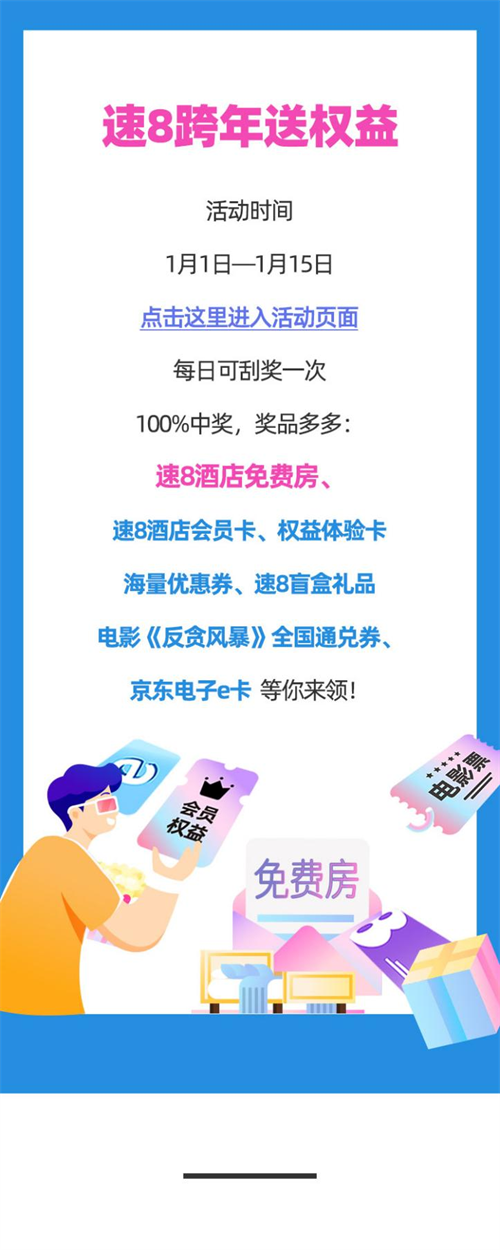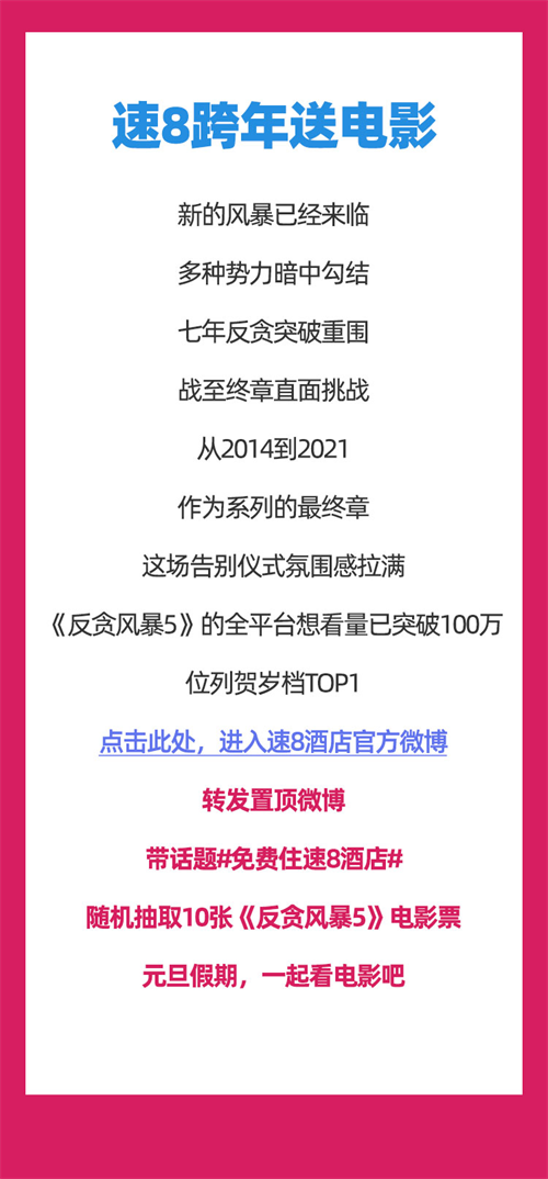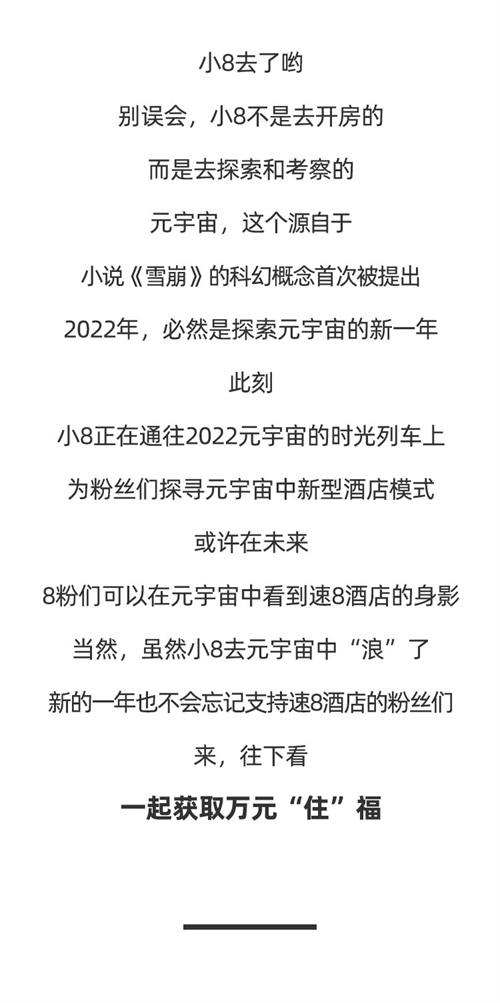 跨年,到元宇宙世界寻找“住福”宝藏 温德姆酒店集团 · 2021-12-31 19:08:12 分享到 打开微信“扫一扫”,打开网页后点击屏幕右上角分享按钮。 进入速8酒店官方微博,参与活动。 进入速8酒店公众号,点击头篇,进入活动页面进入速8酒店官方微博,参与活动 速8酒店 0