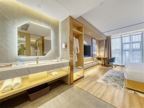 客房则采用无实墙设计,使空间更宽敞,再通过亲肤柔软的床品和品牌定制洗护,打造舒适的充满品质感的休息空间。而房间配备的符合人体工学的办公座椅,让商务出行也能事半功倍!