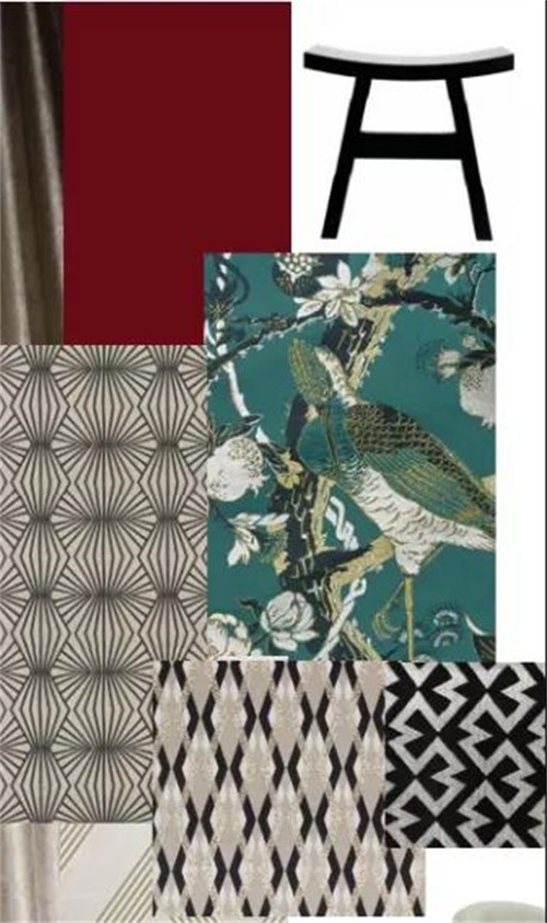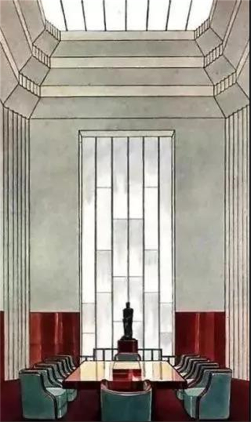 空间配色中,Art Deco风格偏爱营造一种轻奢质感,以金属色系与明亮色系是其整体的主打色调,鲜艳明亮的配色带有极强的视觉冲击,将整个空间氛围推向高潮,极富有艺术张力和贵族气质。同时具有金属质感的线条、几何分割运用于墙面的装饰与分割,将工业气息浓重的硬朗的线条与柔软、温和的家具及织物等进行融合,形成一种戏剧性的空间节奏感。