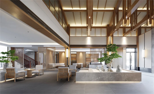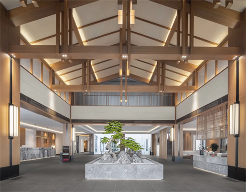 在轩敞的大堂,古建的梁柱结构,徽派的人文雅韵,以一种新东方的表现形式传达。大堂中央,一颗嶙峋的绿松,几块小石制成的山,便是一处景观。一面墙大面积地绘有缥缈淡远的水墨画作。大理石台,黑色白色的线条游走,与墙上水墨高低呼应。