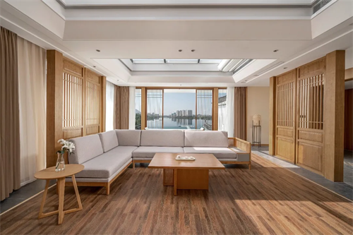行政套房有休息室、卧室、卫生间。整体采用木质材料,木质的窗、门、桌椅等家具,给人自然宁静之感。休息室中央陈列着茶桌,茶桌两边是沙发。窝在沙发里,品茶、聊天,放松自在。天花是透明的玻璃,可欣赏天空白日黑夜的种种变化。卧室很敞亮,大面积落地窗将自然景色纳入房间。靠床头的一面墙,有两处壁柜,放置着瓷器等艺术品,内置灯光将艺术品烘托得更有质感。