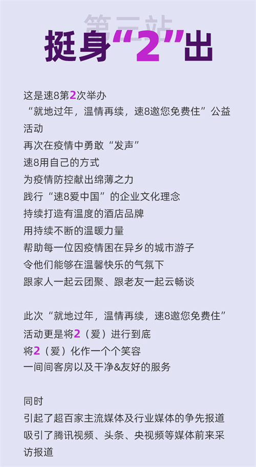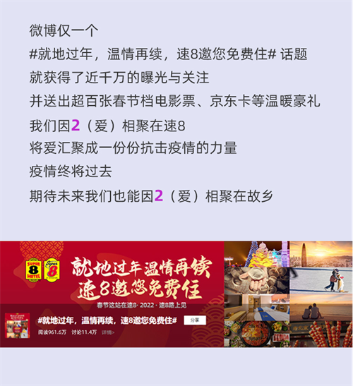 比“胖dundun”更有爱的是... ... 温德姆酒店集团 · 2022-02-21 09:15:28 分享到 打开微信“扫一扫”,打开网页后点击屏幕右上角分享按钮。 登上这趟爱心专车,看看比“胖dunduan”更有爱的速8吧。 (图片来源温德姆酒店集团) 速8酒店 温德姆酒店集团 0