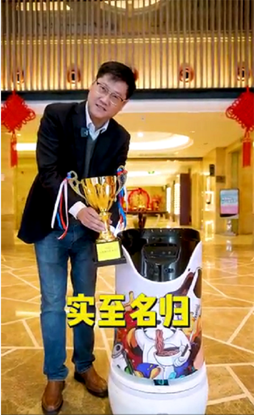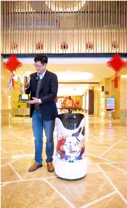 颁奖仪式上,万达酒店及度假村中端酒店事业部市场销售总经理陈仲纬庄重地将“2021年度最佳优秀员工”颁发给了一位不拿工资的特殊员工——酒店服务机器人momo。