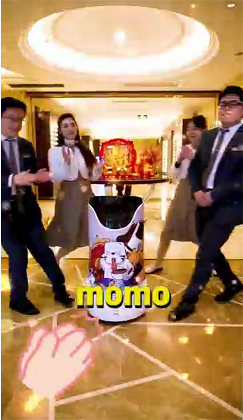 每一个入住的宾客,总是在不经意间遇到一个“小可爱”。即使正忙着为宾客速递各种小食和洗漱用品,“momo”也不忘用憨憨的电子音向宾客问好。