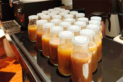 在此次开业活动上,室外的雪花飞舞映衬酒店内幽幽茶香,颇有文人“雪水煎茶”的雅致意象。大堂吧人气爆棚,外观格外亮眼的“红蓝BUFF”养生茶饮得到嘉宾的赞赏,还有温热的五谷杂粮汁,提供令人惊喜的创意风味混搭,可作为雪天暖身的“最佳伴侣”。