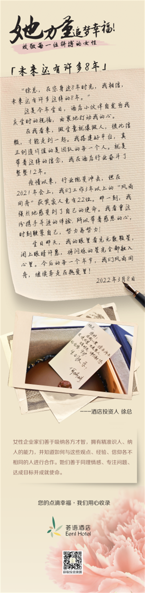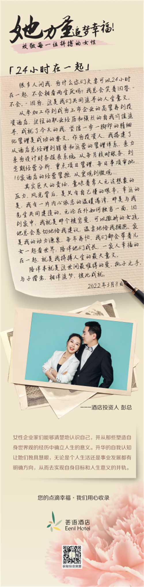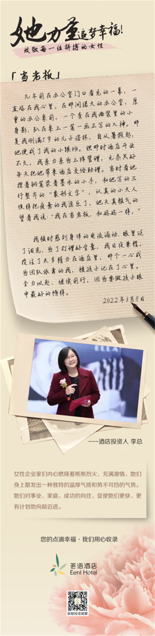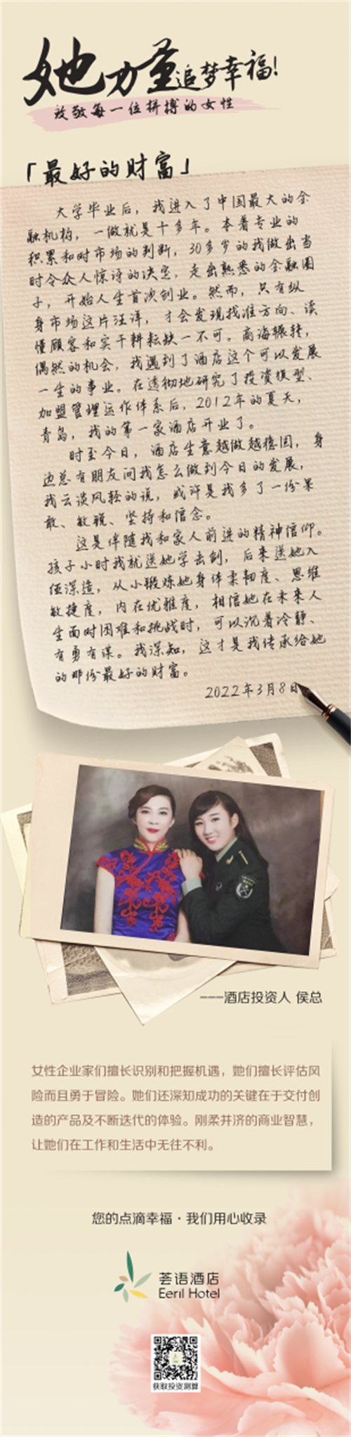 从去年东京奥运会到最近圆满落幕的北京冬奥会,中国女孩们竞相展现了她们在各自热爱的领域闪闪发光的“她”力量。在酒店行业的投资人群体中,不乏坚强、独立、不设限、努力实现人生价值的女性投资人,她们也在用自己的故事,对“她”力量作出了完美诠释。在第112个3.8国际妇女节到来之际,倡导自然幸福生活方式的荟语酒店,探索行业女性投资人背后的“她”力量,收录她们的点滴幸福。