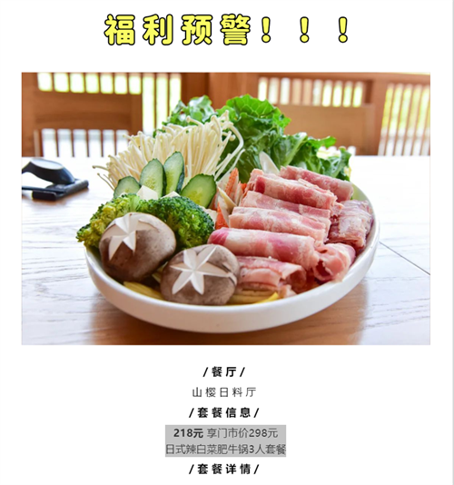 3月7日,218元就可以享受山樱日料厅日式辣白菜肥牛锅3人套餐,千万别错过了哦~