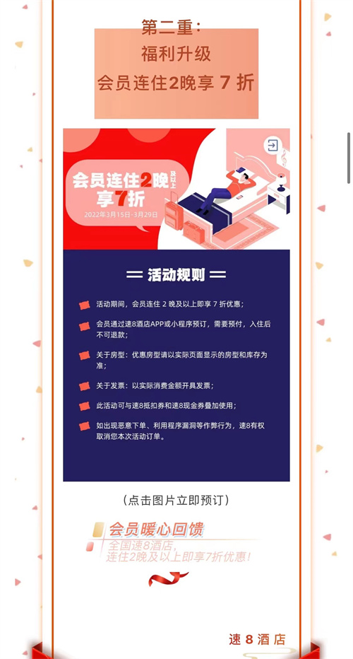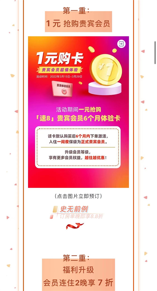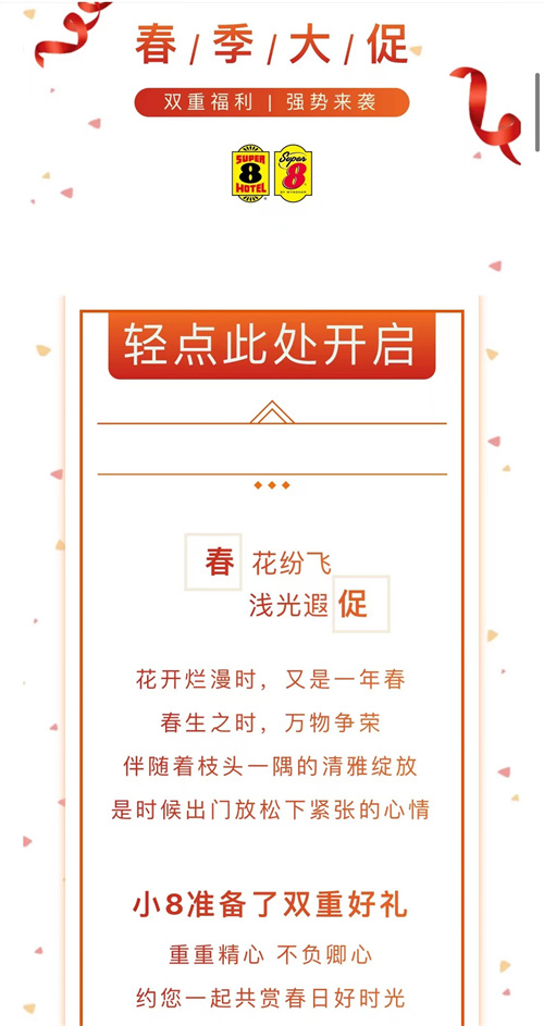 春季大促,双重会员福利,强势来袭! 温德姆酒店集团 · 2022-03-15 09:22:01 分享到 打开微信“扫一扫”,打开网页后点击屏幕右上角分享按钮。 2002速8酒店福利优享 (图片来源速8酒店) 速8酒店 温德姆酒店集团 0