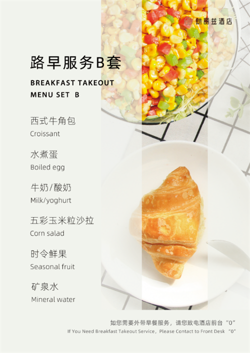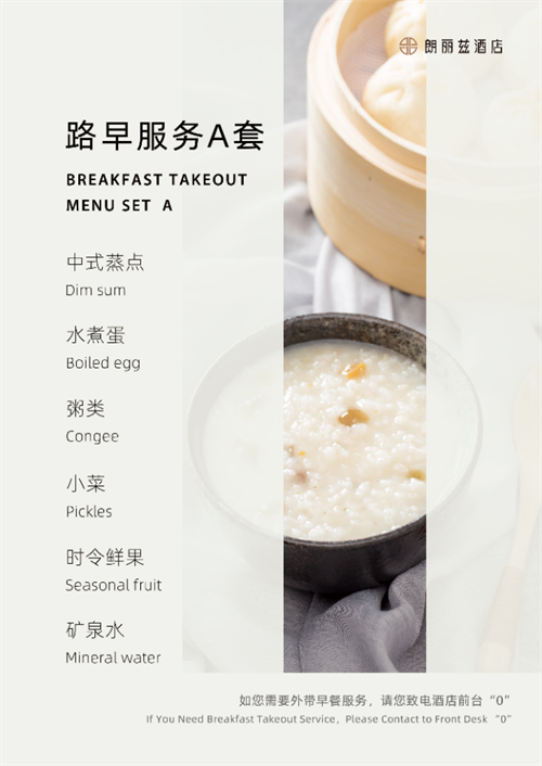 在日常早餐基础上升级路早服务,在原有基础上,推出中式和西式两套菜单,新升级的全新的外带服务,对于在酒店早餐营业时间之前离店的宾客,朗丽兹酒店准备了营养便捷早餐,供顾客在途中享用。对于早上起晚已经闭餐和想在房间用餐的宾客,亦能享酒店房间送餐。