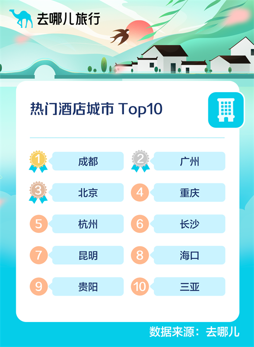 记者从去哪儿了解到,从目前酒店预订量来看,清明期间最热门的城市是成都、广州、北京、重庆、杭州、长沙、昆明、海口、贵阳和三亚。上海受到疫情影响,首次跌出top10;旅游资源丰富的贵阳首次跻身TOP10城市。