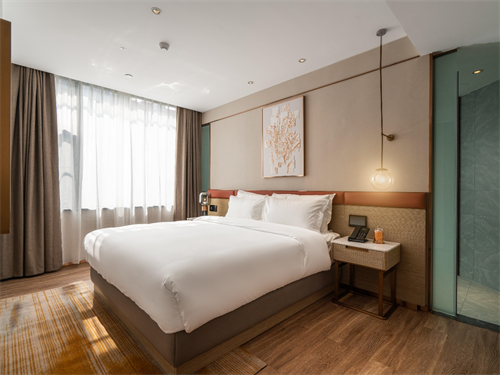 除「羊城」外,广州还有「穗城」之称。"风吹麦成浪"这一自然中的元素被设计运用于大堂空间中,赋予空间动态的生命感。麦穗成熟时的金黄色泽则成为客房的色彩基调,搭配原木色中式家居,营造出自然温暖的气息。