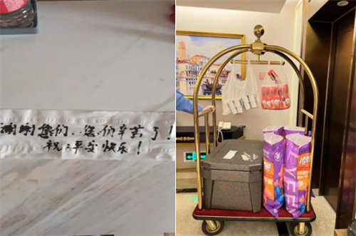 此外,酒店人员考虑到物资运送人员的不易,还积极为送物的司机们提供餐食和矿泉水。