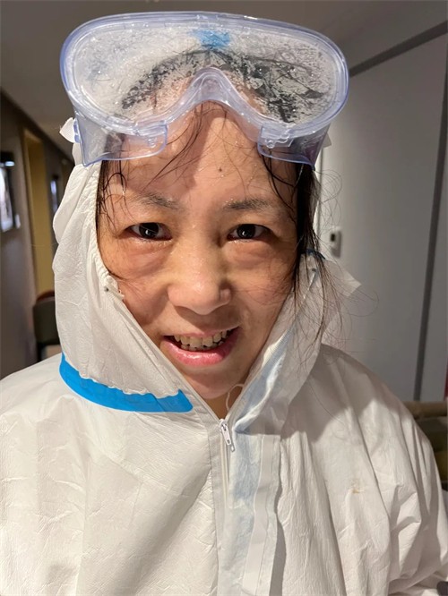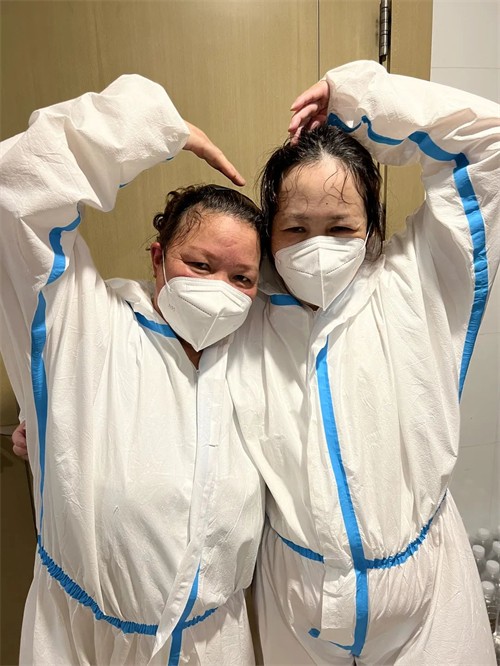 客房部陈士凤、王素梅、刘满联等三人住一间,没空调,在上海连续两天33度的日子里,西晒房间非常闷热,但她们克服着。连续工作穿着大白不方便,她们就不喝水、不上厕所。每天工作结束时,她们全身湿透、双手发白起皱、满脸通红、脸上被勒出深深的压痕,大家看在眼里,疼在心里。
