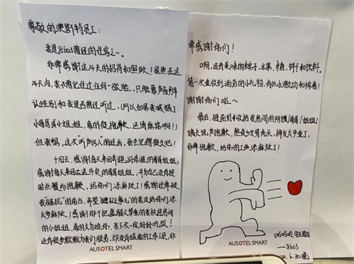 隔离病毒不隔离关怀,酒店工作人员贴心细致的服务,温暖了集中隔离人员的心。许多隔离者解除隔离后,都会留下口头、微信以及纸条表示感谢。