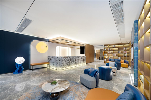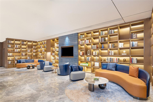 同时,大堂在这里被划分成不同区域,方便客人在这些空间进行社交、放松、工作、商务洽谈等。再加上整齐有序的书柜背景墙的设计,不仅突出了品牌格调,也营造出了空间的独特态度。