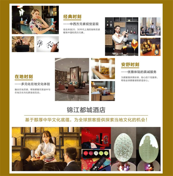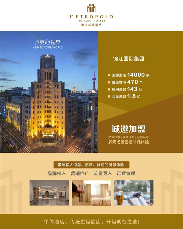 锦江酒店(中国区)是锦江国际集团“深耕国内、全球布局、跨国经营”的全球品牌战略重要布局,旗下酒店品牌覆盖多元市场,致力于为消费者提供高品质和多元化的出行体验。锦江都城是锦江酒店(中国区)旗下定位国际四星级的文旅探索型高、中端酒店品牌,起源于上个世纪30年代的上海。目标客源为全球中产旅居休闲商务客,凭借品牌国际化团队的管理让全球游客享受一种别致的文旅待客之道。目前已超300家酒店,遍布中国100多个城市。未来3-5年锦江都城品牌将沿“一带一路”国家布点60家酒店,全球将达到1000家酒店规模,致力于打造具有国际影响力的文创酒店品牌。锦江都城酒店,点亮心视界。
