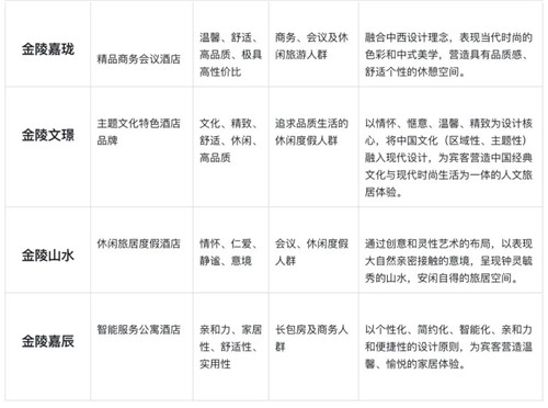 在品牌矩阵上,除金陵主品牌外,金陵酒管聚焦中高端酒店市场,衍生出了金陵精选、金陵嘉珑、金陵文璟、金陵山水、金陵嘉辰等子品牌,构建涵盖高端商务酒店、精品商务酒店、休闲旅居酒店、主题文化特色酒店、智能服务公寓酒店的多品牌体系。这背后是公司对于消费市场喜好和投资市场需求的深刻洞察,迎合消费分级的趋势,结合不同类型品牌的完善形成不同酒店品牌的差异化矩阵,既能满足不同消费群体不同的需求,更能满足不同层级的投资人不同项目的投资需求。
