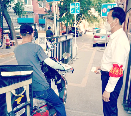 5月22日王跃雷同志也申请参加防疫核酸检测任务。他不顾北京高达35度的气温,顶着烈日,耐心为老人和孩子扫码。