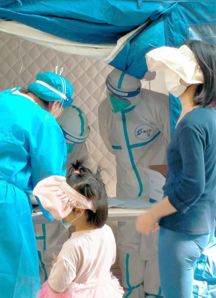5月21日梁红红利用休息时间自愿申请核酸检测工作。她深知这个任务的危险性,但还是积极申请参加了。顶着北京32度的高温天气下,全副武装穿着防护服,汗如雨下,额头上的汗水流到眼睛里也顾不上擦。