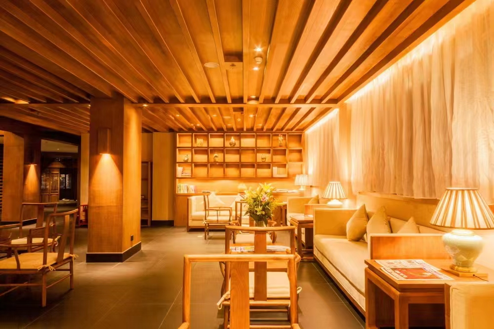 酒店建筑面积约5800平米,分为接待区、客房、餐饮、休闲、会议五个功能区域。五大功能区域,在装饰风格上,以现代中国风方式对空间化繁为简,演绎原生态,处处透露出典雅与朴素,过渡得自然流畅;在服务运营中,以人文的方式关怀客户的心灵,释怀疲惫,远离纷扰,点点滴滴流露出对客人身心的呵护。